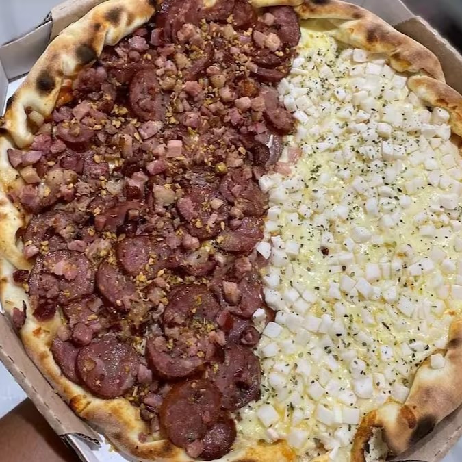 Pizza De Calabresa Com Bacon E Queijo E Meia Portuguesa Presunto Mussarela Milho Ovos E Palmito E Borda Vulcão De Requeijao E Cheder 8 Pedaços