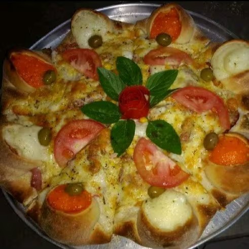 Pizza Vulcão Mussarela E Milhoe Tomate E Manjericão Caprichada Molho De Tomate Azeitona Mussarela 8.pedacos E Borda De Requeijao E Cheder