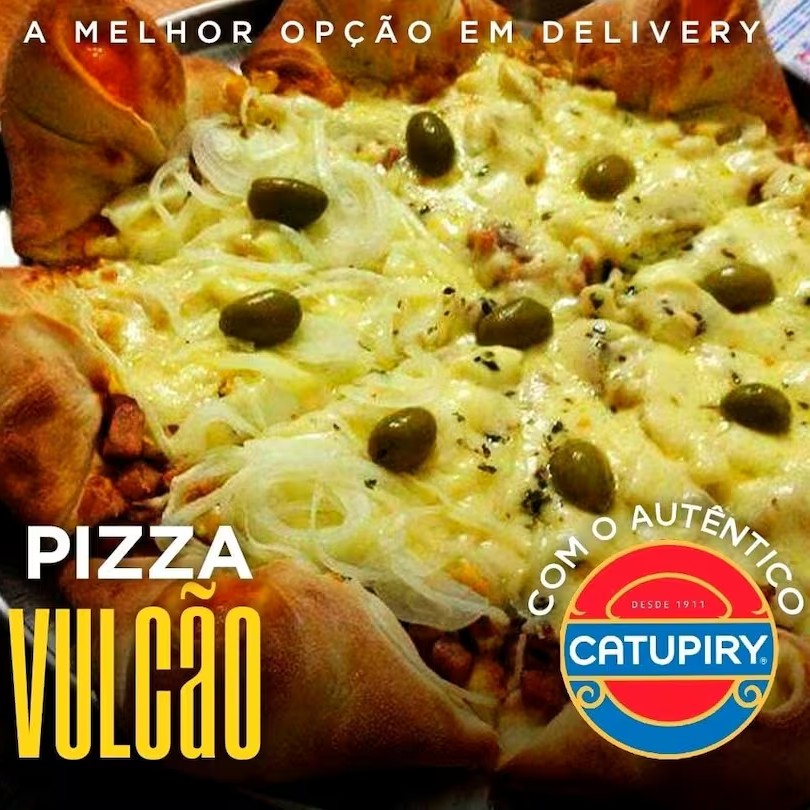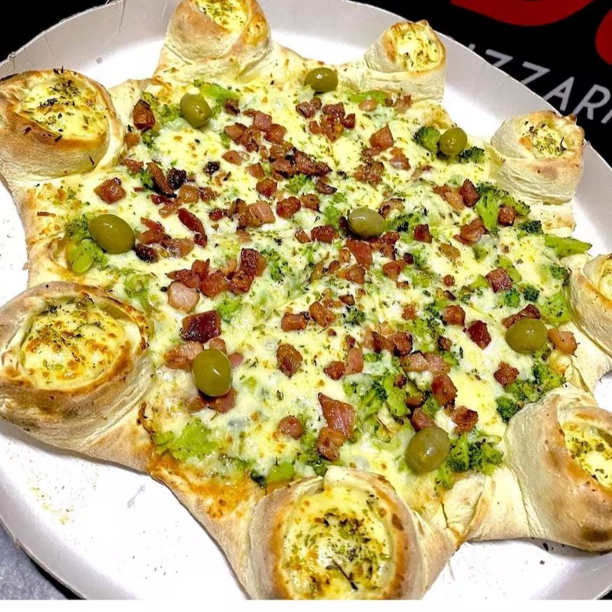 Pizza Vulcão De Borda Mussarela-Molho De Tomate -Brocolis-Bacon-Mussarela Azeitona Oregano E Borda Caprichada Recheada De Mussarela Vulcao 8 Pedaços