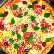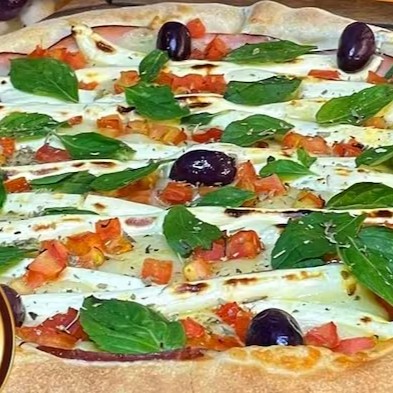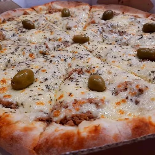 Pizza de mussarela tomate queijo orégano e azeitonas + borda requeijao grátis 8 pedaços caprichada bem recheada