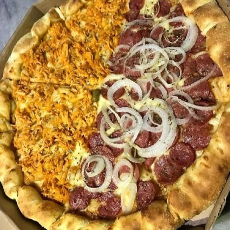 Pizza metade calabresa com cebola e metade frango com Catupiry molho de tomate muita mussarela calabresa frango cebola azeitona e orégano 8 pedaços