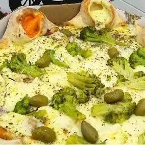 Pizza De Vulcao Brócolis Com Mussarela Por Baixo E Muito Brócolis Azeitona E Orégano Molho De Tomate E Borda Cheder E requeijao 8.Pedacos caprichada e bem recheada