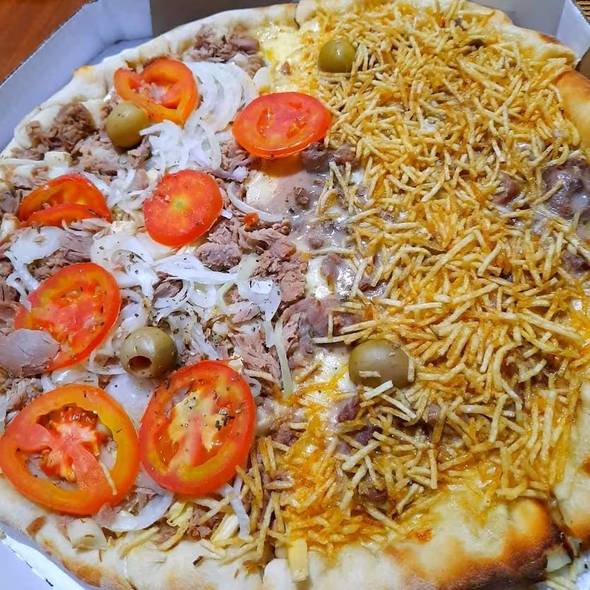 Pizza de 8 pedaços Meia Hot Dog Com Cheder E Meia Marguerita .molho de tomate e molho de Hot dog muita mussarela tomate e manjericão a outra mussrela cheder salsicha e batata palha 8.pedacos caprichada