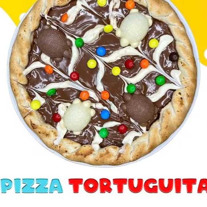 Pizza 4 pedaços 2 amores tortuguita Confete chocolate branco e preto 4 tortuguitas 4 pedaços caprichada