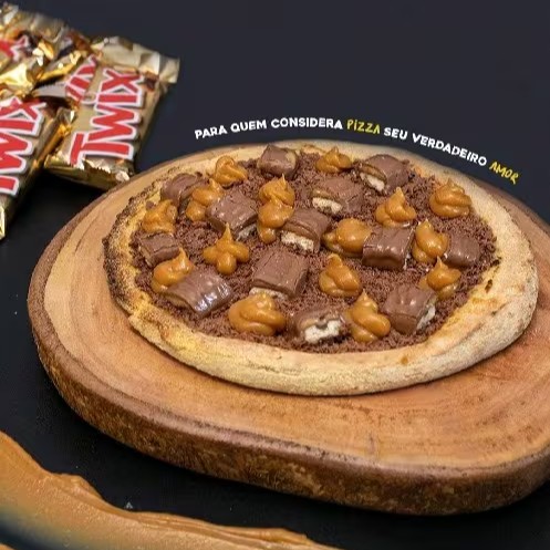 Pizza broto 4 pedaços chocolate ao leite com bastante chocolate twix e doce de leite caprichada