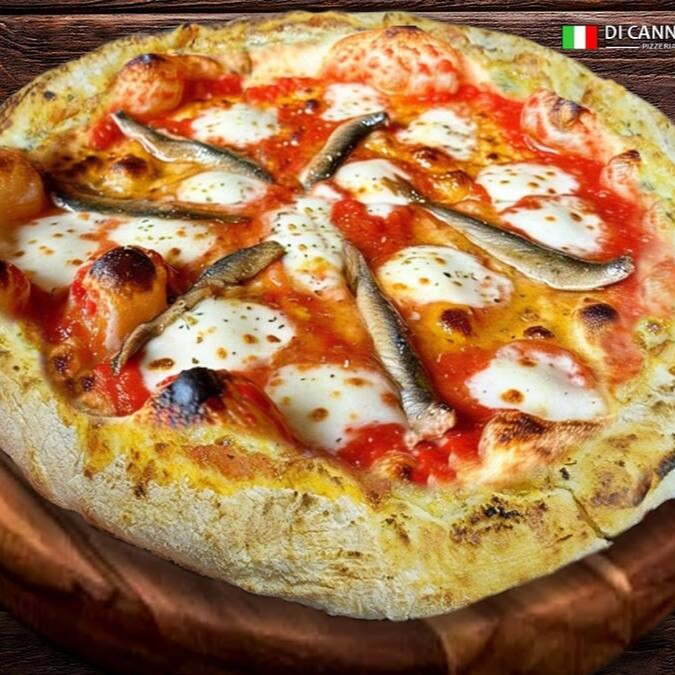 Massa artesanal, molho de tomate italiano, mussarela, aliche especial, azeitonas, orégano e azeite.