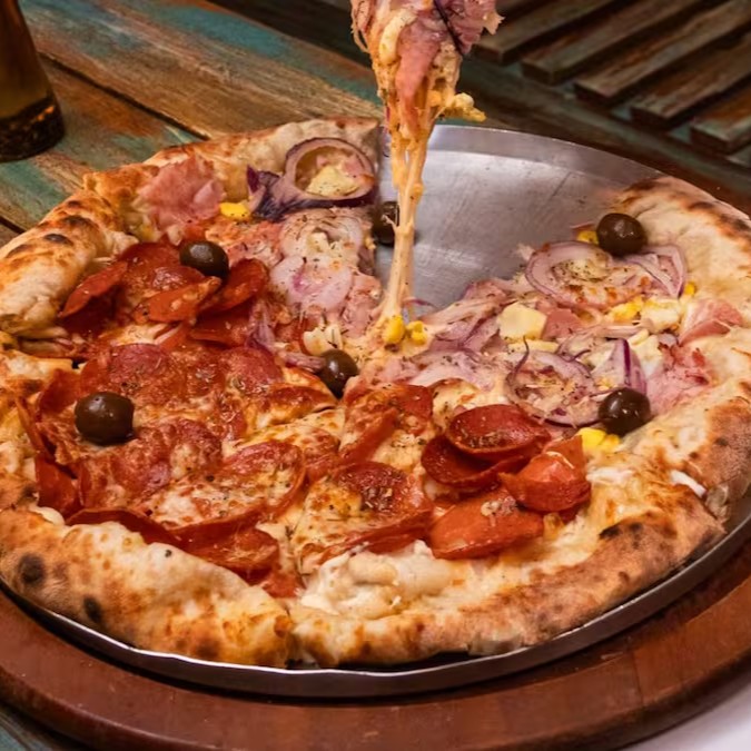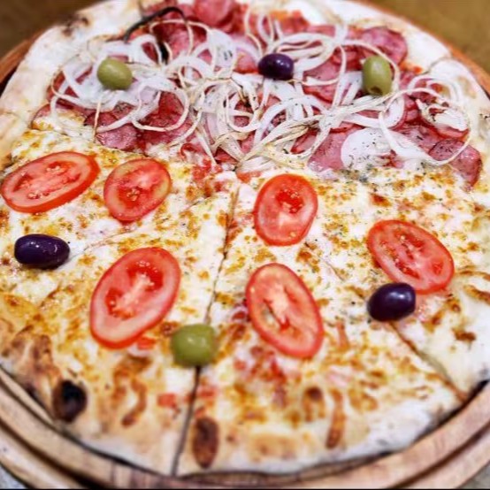 Metade portuguesa com presunto, ovos, cebola e metade quatro queijos com uma rica mistura de mussarela, provolone, parmesão e gorgonzola. Uma combinação clássica e cremosa para todos os gostos!