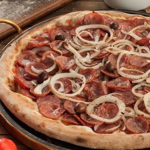Calabresa fatiada, molho de Tomate, e Cebola( obs sem Mussarela)