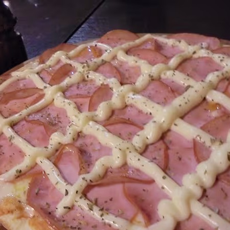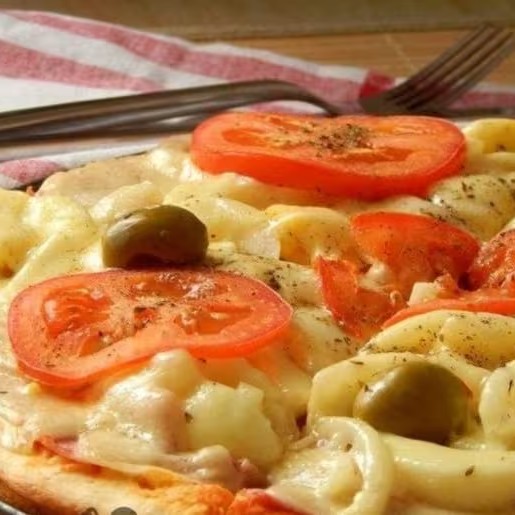 Molho de tomate, presunto, cream cheese, mussarela, orégano e azeitonas