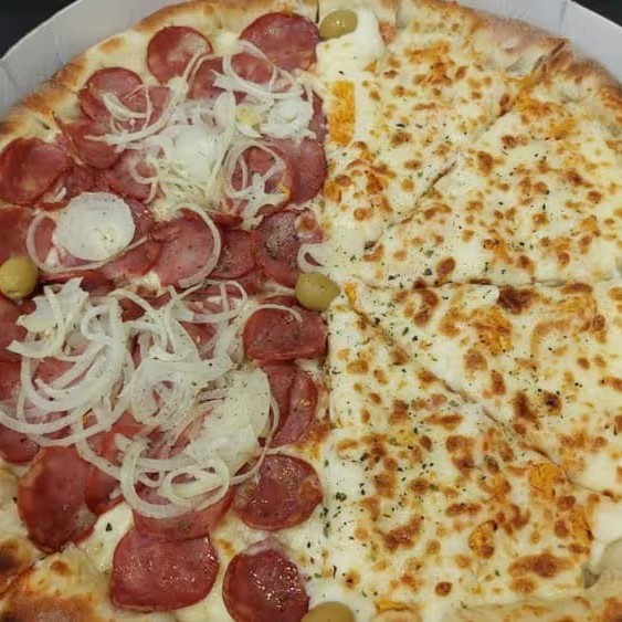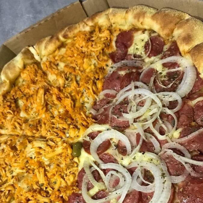 São 12 pedaços de Pizza, meia Frango com Requeijão e meia Calabresa Acebolada + Borda de Requeijão Cremoso Grátis!