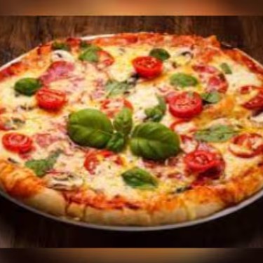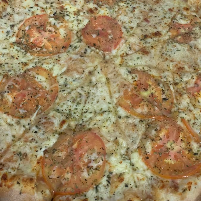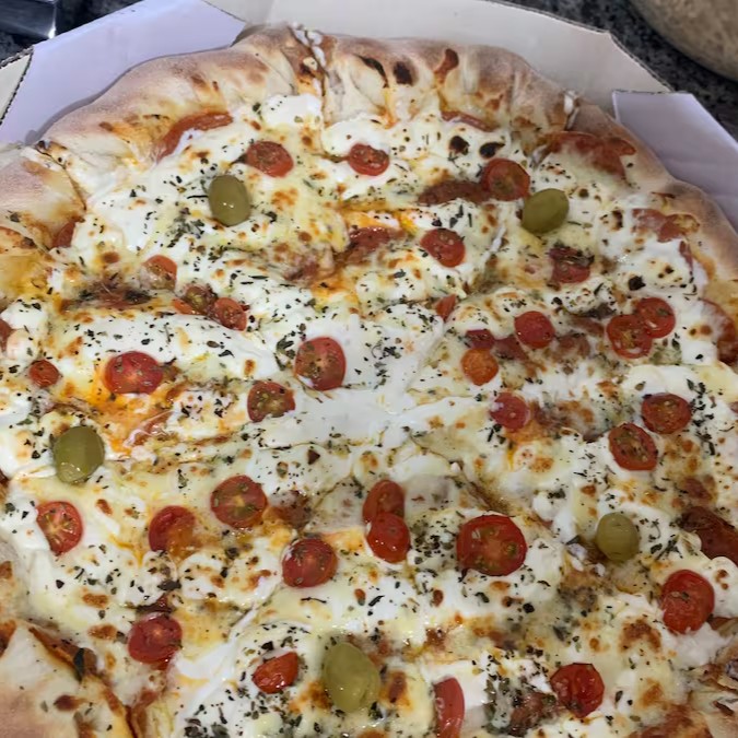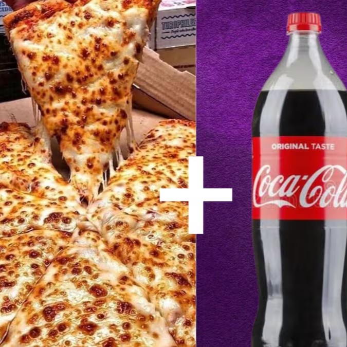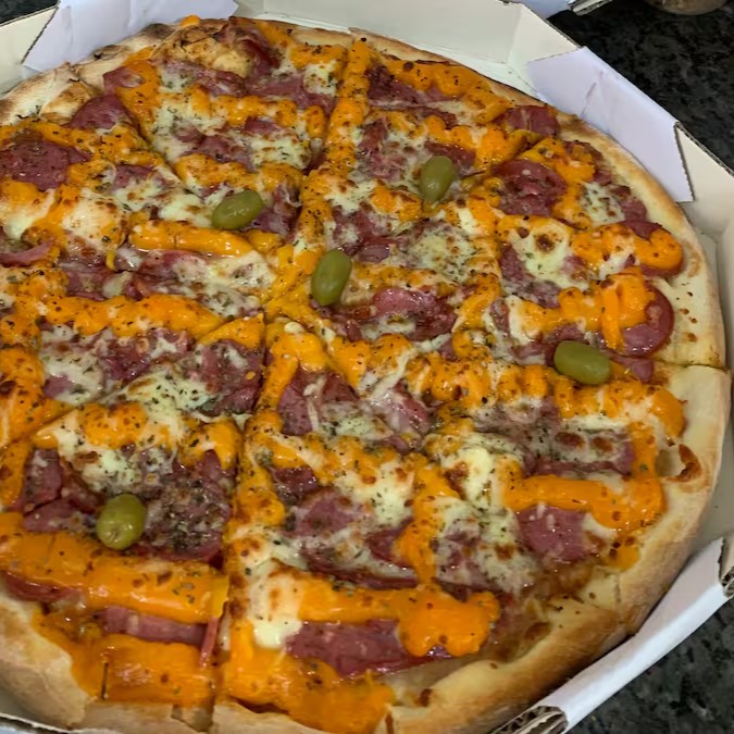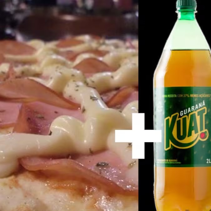 Molho de tomate, mussarela, presunto, fatias de tomate, azeitonas e orégano + Refri Kuat