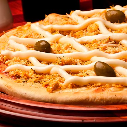Molho de tomate frango requeijão cremoso mussarela orégano e azeitonas