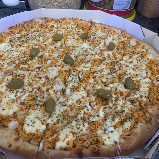 Molho de tomate, mussarela, frango, Catupiry, azeitonas e orégano + Refri Kuat