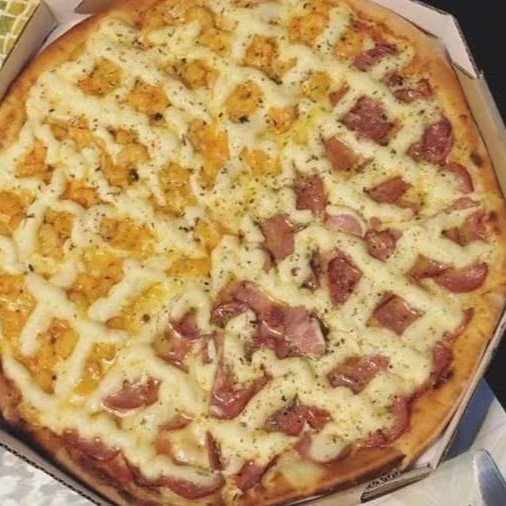 Pizza meio a meio de 12 pedaços: metade Frango Catupiry, metade Provolone e Mussarela + 1 refrigerande Kuat de 2litros.