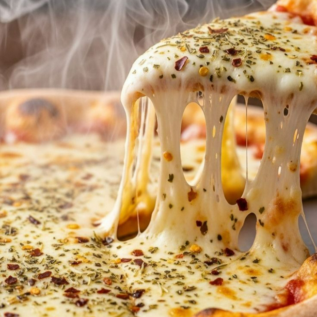 Pizza de 8 pedaços sabor 4 Queijos Super recheada com Mussarela, Catupiry Provolone Gorgonzola
