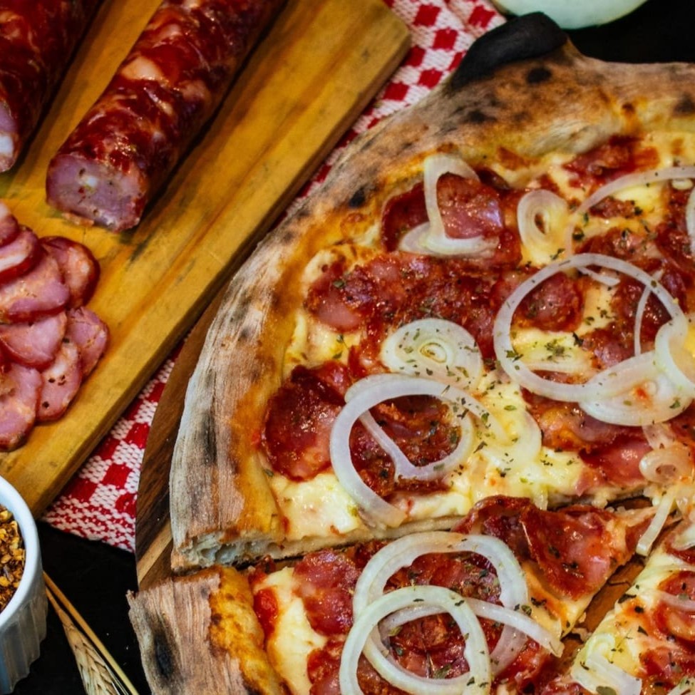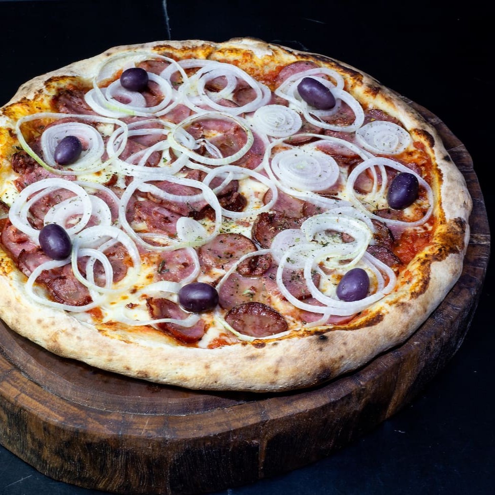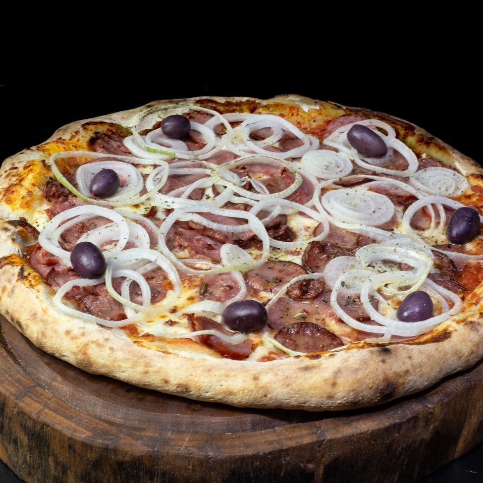 Molho de tomate, muçarela, calabresa, cebola e azeitonas