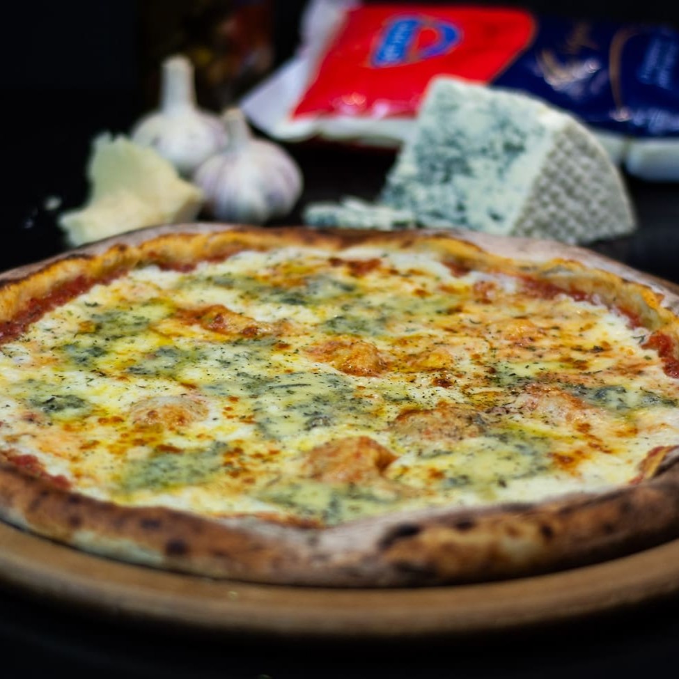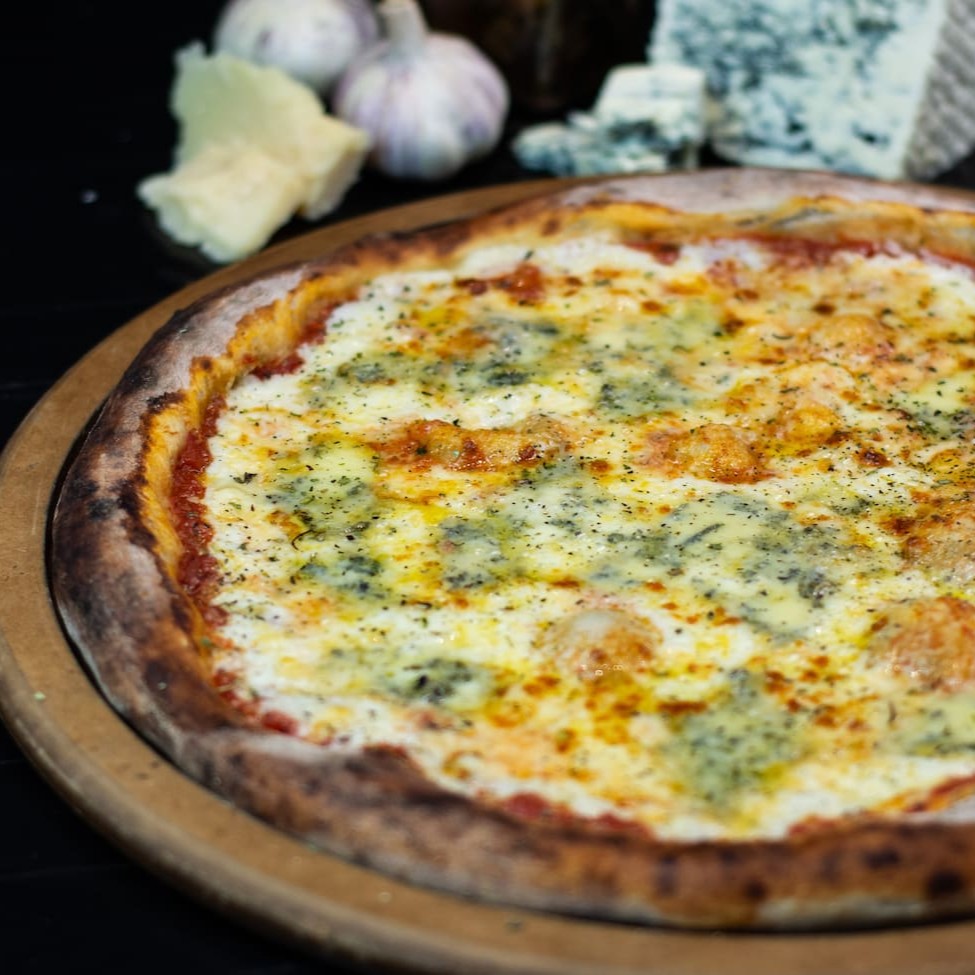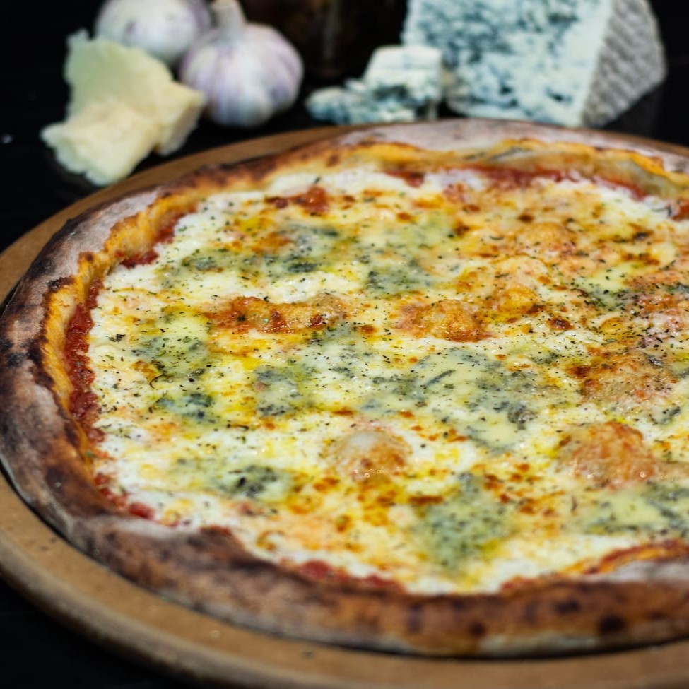 Molho de tomate, muçarela, gorgonzola catupiry e parmesão