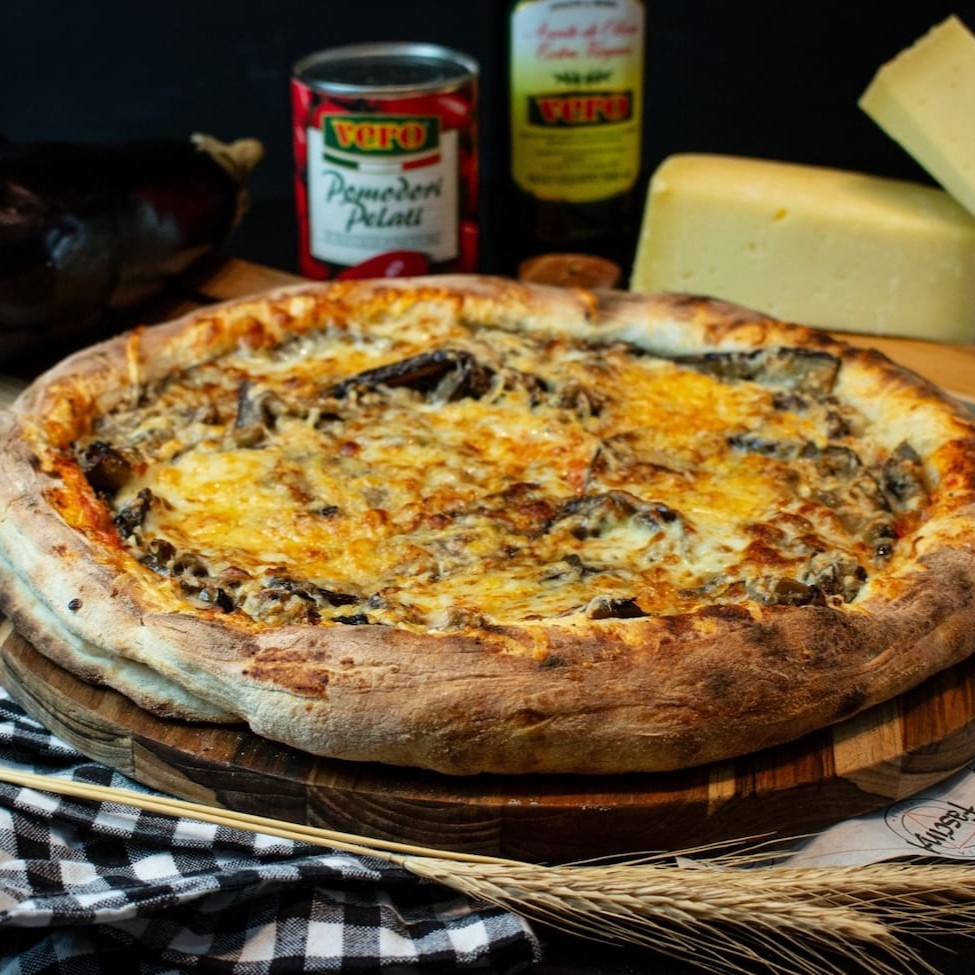 molho de tomate, berinjela marinada ao alho, muçarela e parmesão