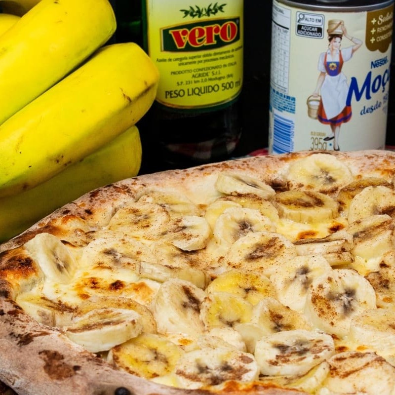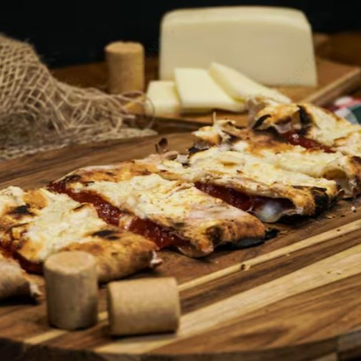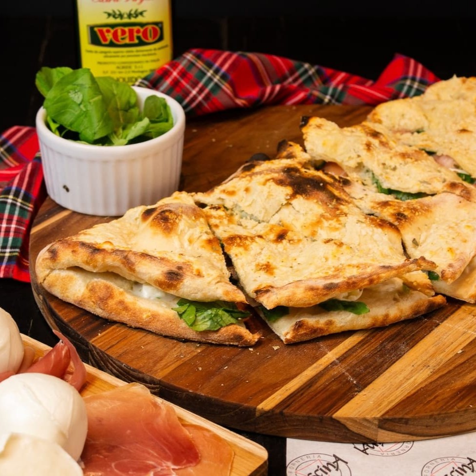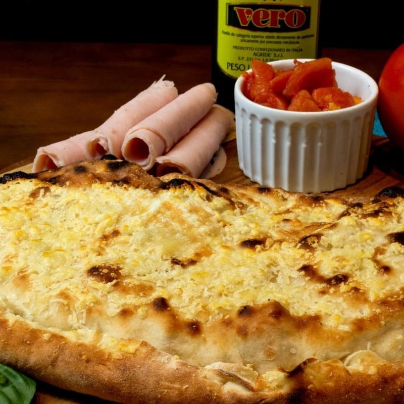 Massa de pizza fininha, recheada com com, mussarela, Catupiry, gorgonzola e parmesão. Acompanha um suco Dell Valle uva lata.