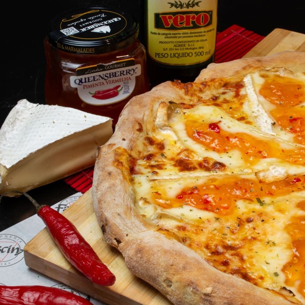 molho de tomate, muçarela, queijo brie e geleia de pimenta