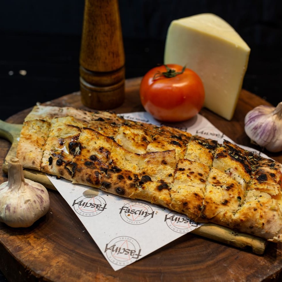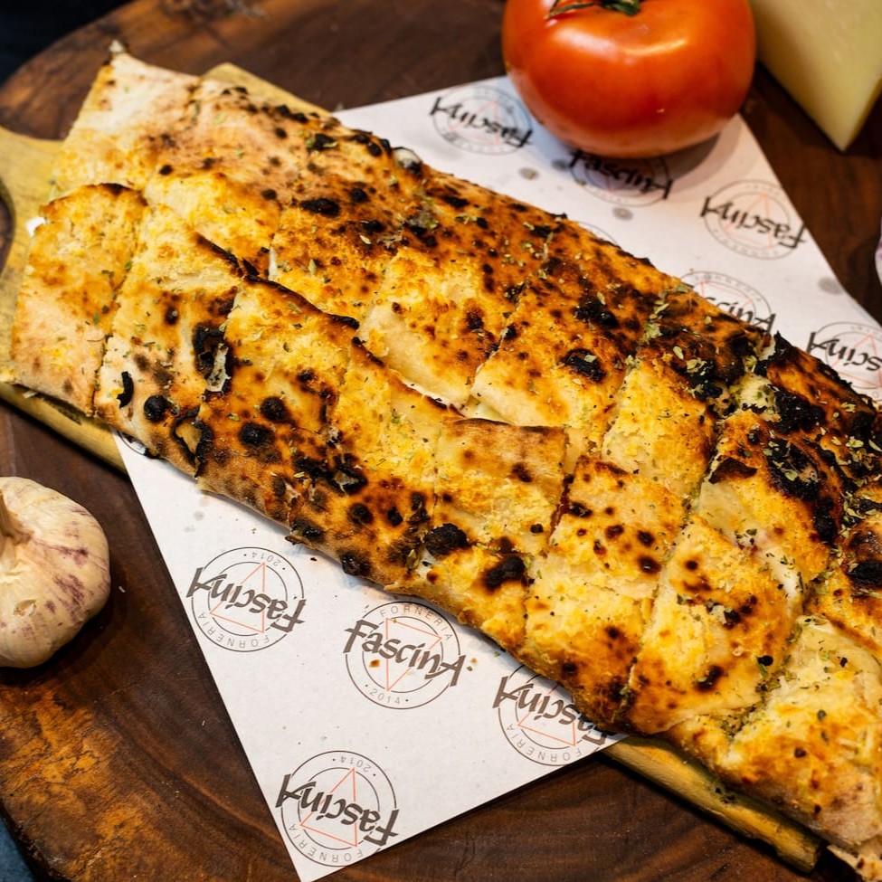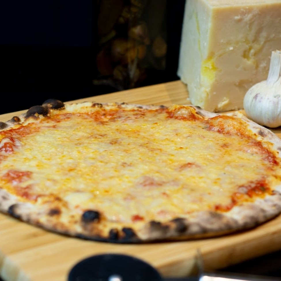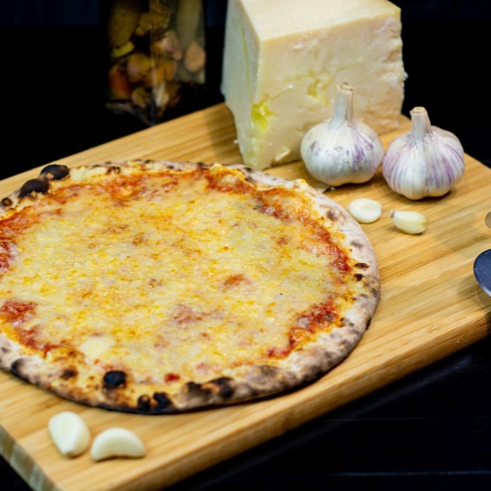 Massa de pizza fininha com molho de tomate Italiano, alho refogado salpicado com parmesão