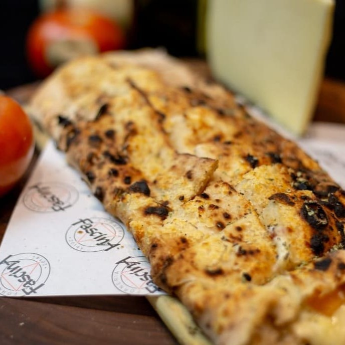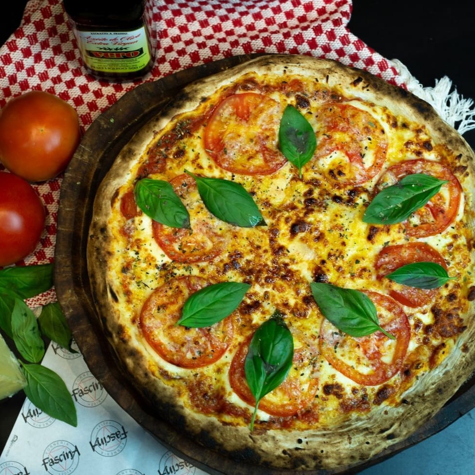 Massa de pizza fininha recheada com muçarela, rodelas de tomate, aliche e parmesão