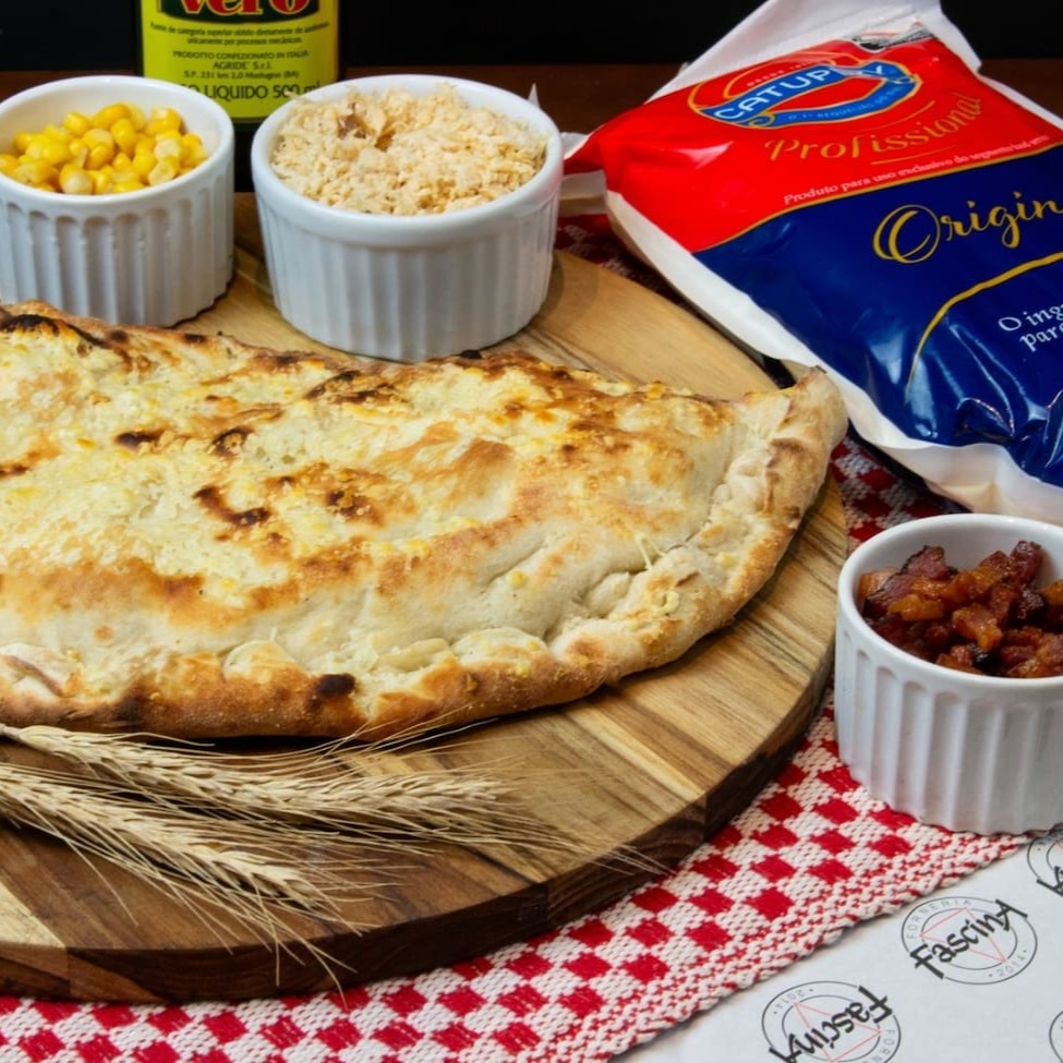 Massa de pizza fininha, recheada com frango desfiado, Catupiry️, milho e bacon