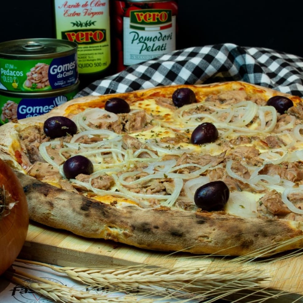 Molho de tomate, muçarela, atum sólido, cebola e azeitonas