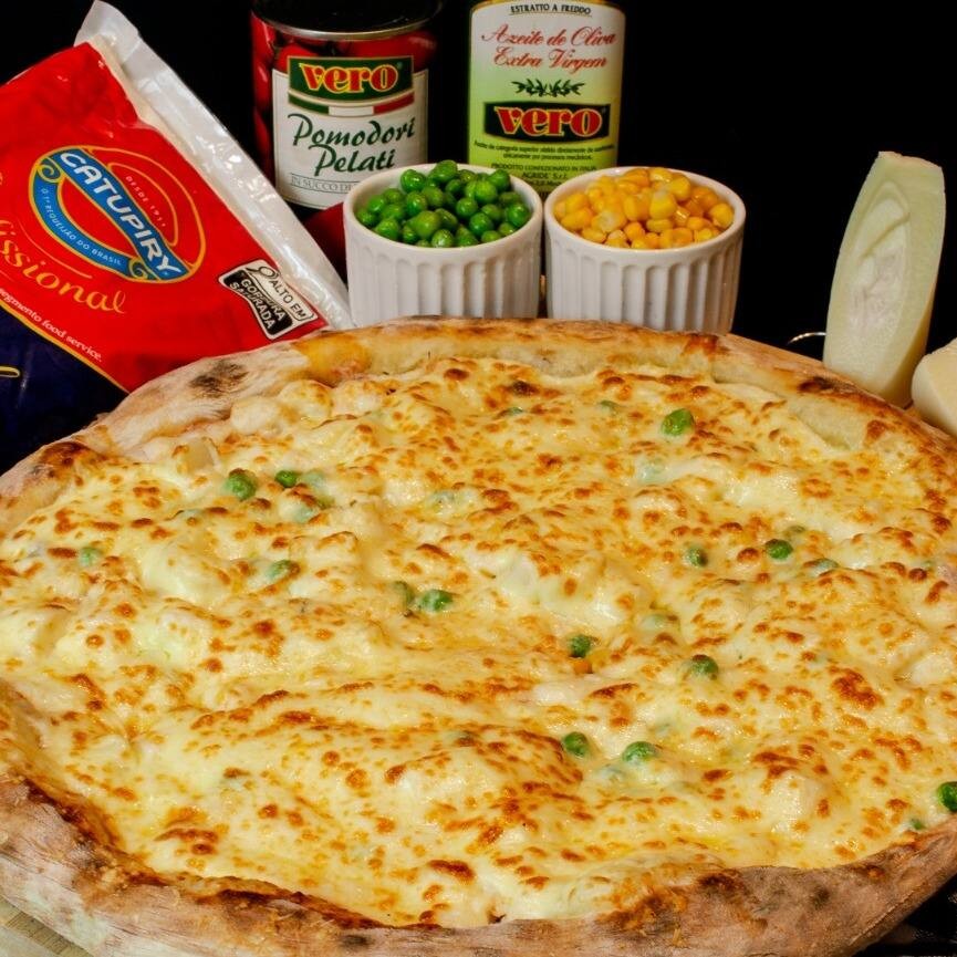 Molho de tomate, muçarela, frango, ervilha, milho verde, palmito, catupiry, muçarela, parmesão