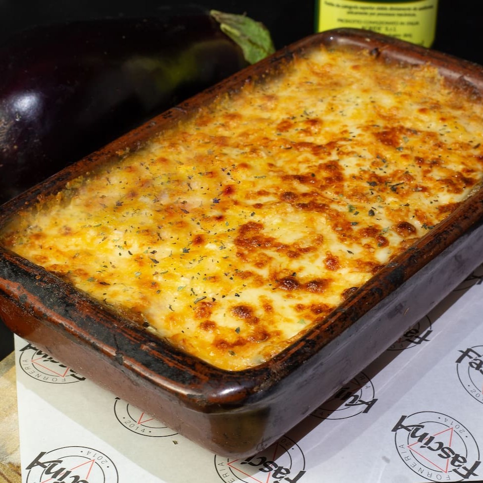 Molho de tomate, berinjela, rodelas de tomate, abobrinha, muçarela e parmesão gratinado