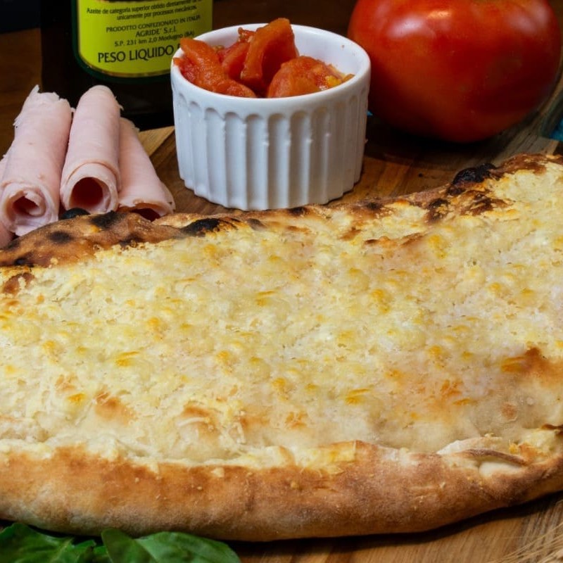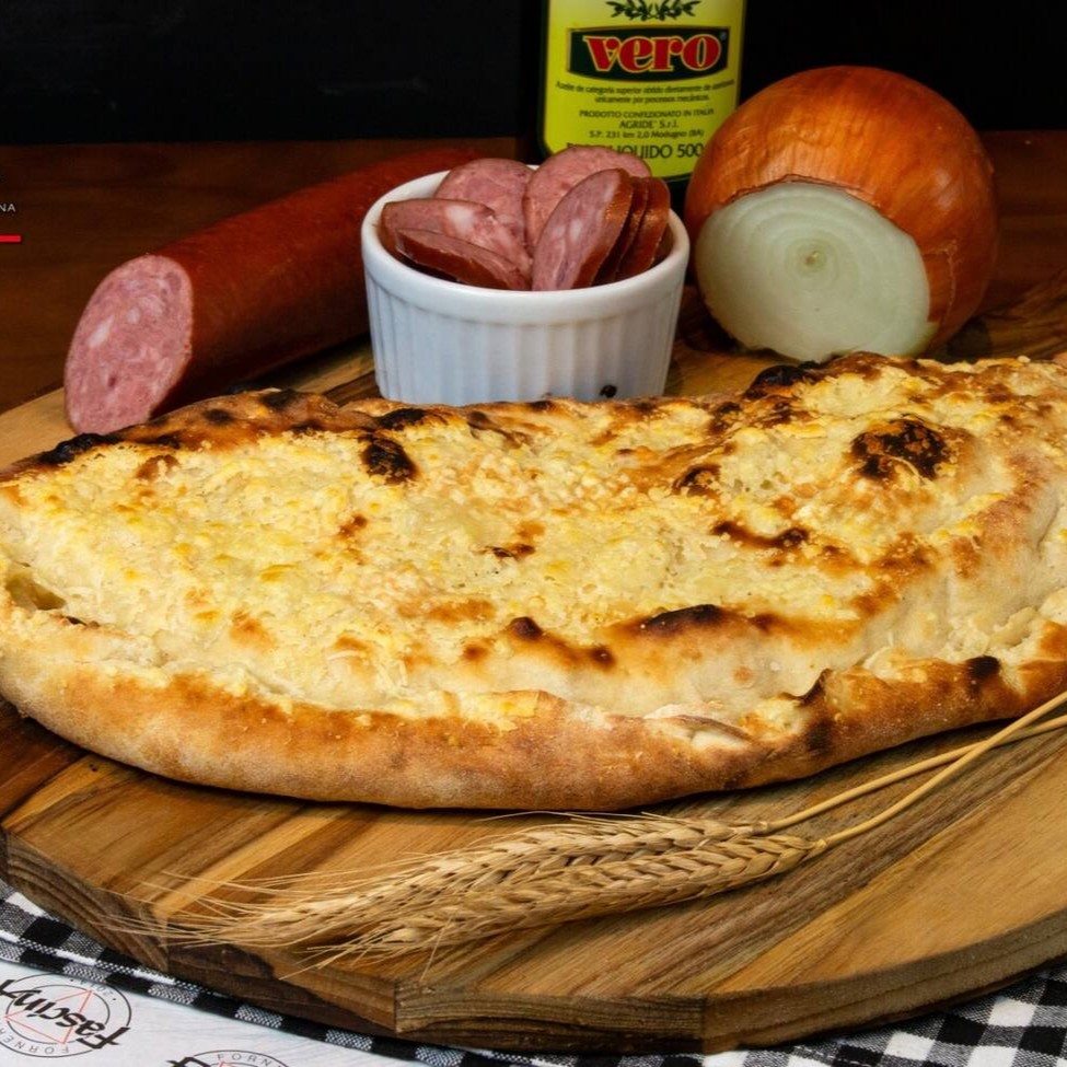 Massa de pizza fininha, recheada com muçarela, calabresa moída e parmesão
