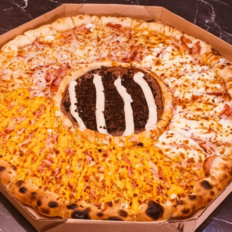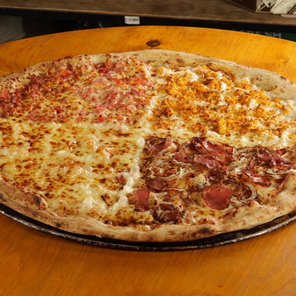 Pizza gigante de 20 fatias (58cm): Calabresa, Frango com Cheddar, Cupim e Brigadeiro. Uma opção completa e saborosa para compartilhar! De Brinde uma Coca 2l