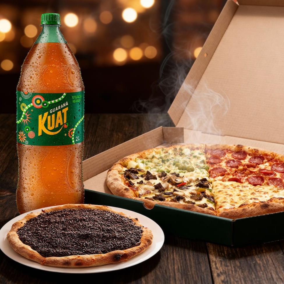 Escolha até 3 sabores sendo 2 na pizza de 8 fatias e 1 na broto + kuat 2L