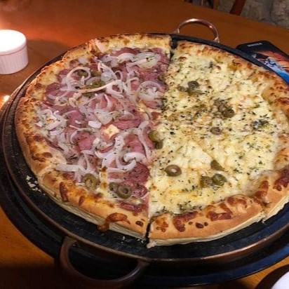 Deliciosa Pizza de 8 fatias sendo Metade Calabresa e Metade Frango com Requeijão