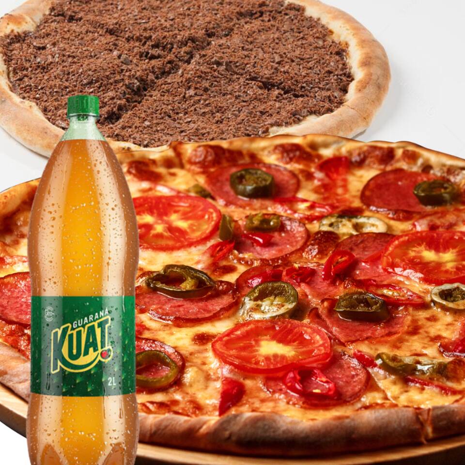 Pizza 20: Milho & Bacon, Queijo, Calabresa E Portuga + Broto Brigadeiro + Kuat2l
