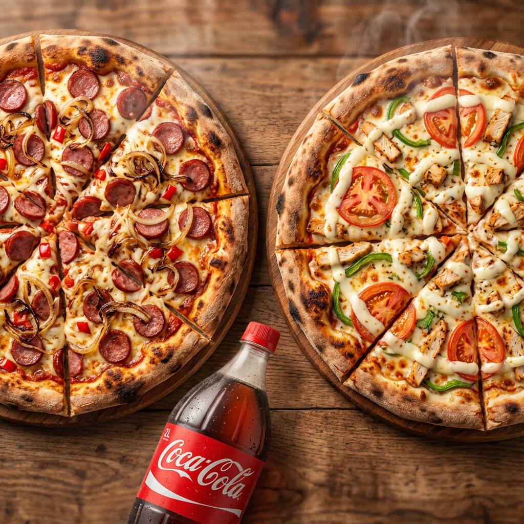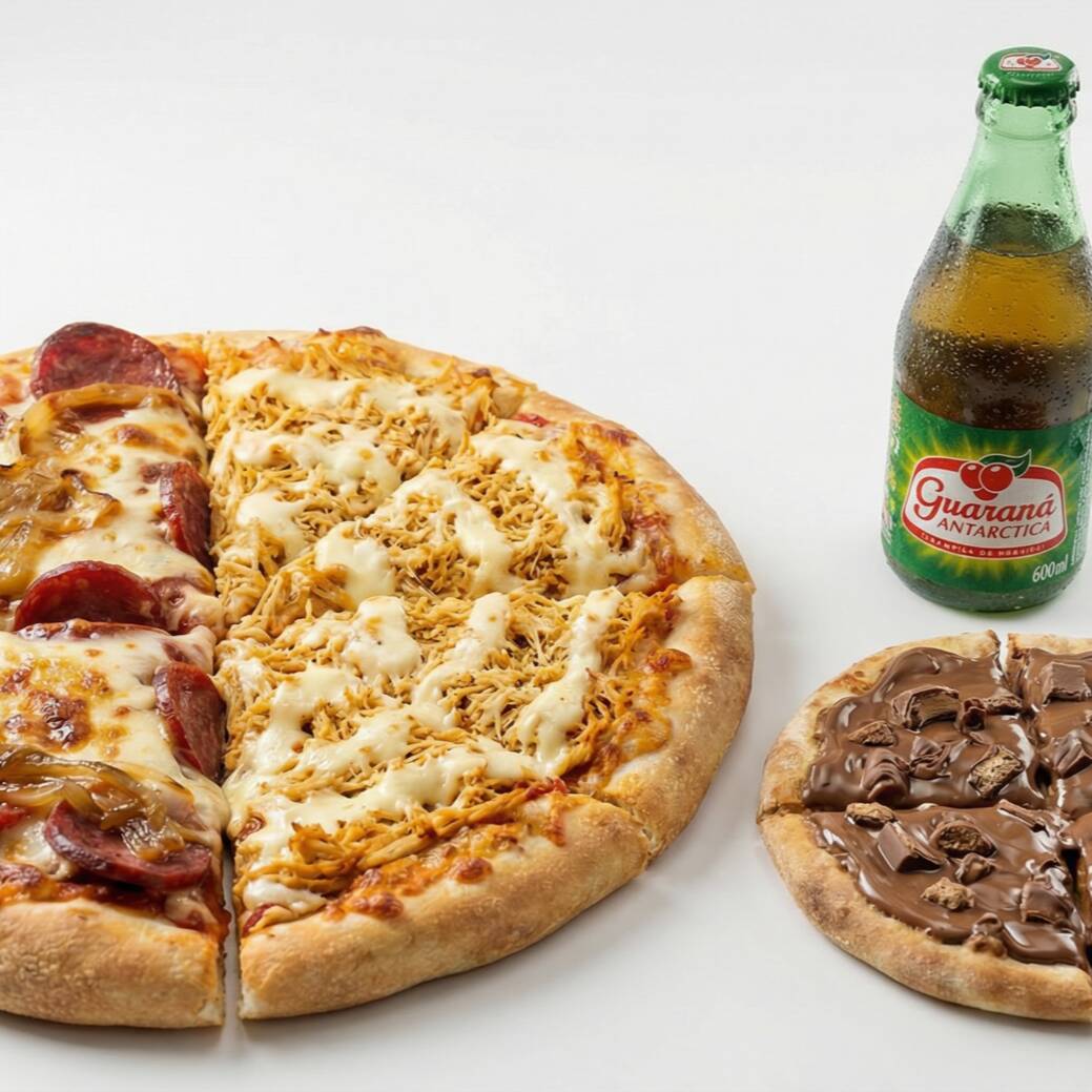 Pizza de 8 fatias + Guaraná 600ml Massa leve e crocante, molho artesanal e muito recheio! Escolha até 2 sabores irresistíveis e aproveite essa delícia!