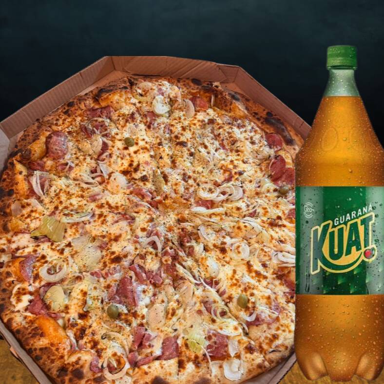 Pizza Gigante (20 fatias – 58cm) + Kuat 2l. Ideal para família, quentinha, recheio generoso e massa especial da casa. Serve de 6 a 8 pessoas. Aproveite o combo econômico e peça agora! -------tags------- Pizza Gigantesca , Massa na Caixa , Promoções, Oferta , Cupom , Menor preço , Desconto , Tempo de entrega , Taxa grátis , kit festa , pizza gigante , combos economicos