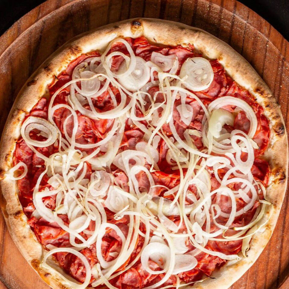 Pizza 1 2 Calabresa Acebolada + 1 2 Mussarela (8 Pedaços)