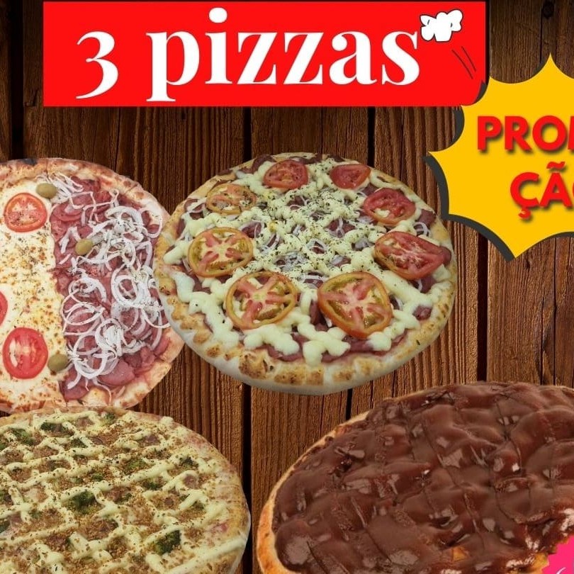 3 pizzas grandes Sabores que participam: Calabresa , baiana , milho cat. , palmito cat, mussarela, Atum, Romeu e Julieta, brigadeiro Escolha 3 sabores Todas as pizzas acompanham borda de requeijão grátis. Caso queira sem borda , coloque nas observações.