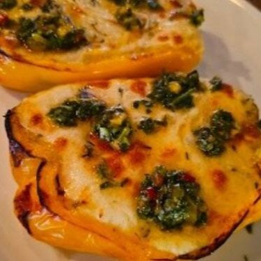 Uma combinação harmoniosa de pimentões meticulosamente assados, trazendo consigo um sabor defumado e único. Eles são generosamente preenchidos com queijo mussarela derretido, criando uma textura suave e cremosa que é irresistível. A adição do queijo parmesão acrescenta uma pitada de sabor robusto e salgado, enquanto um ovo fresco e perfeitamente cozido coroa este prato com uma riqueza extra. Este é um acompanhamento que seguramente eleva qualquer refeição a um novo nível de deleite gastronômico.