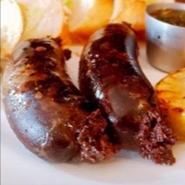 Tradicional Morcilla doce a base de sangue, carne suína, cebola, uva passa e nozes 180g (duas unidades) (peso in natura), acompanha pães, limão siciliano e chimichurri.