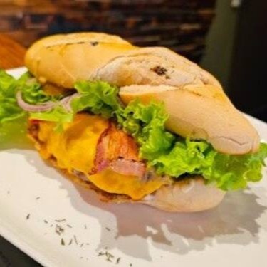 Apresentamos o 'Chivito (lomo)', um sanduíche de conceito uruguaio, preparado com uma generosa porção de filé mignon de aproximadamente 150g, cuidadosamente assado na nossa parrilla a lenha. Servido em um pão francês crocante, este deleite é realçado com a cremosidade de nossa maionese caseira, o sabor defumado do bacon, a suavidade do queijo derretido e a crocância da alface. Para adicionar um toque de frescor, incluímos cebola roxa e tomate. Finalizamos com um toque de chimichurri para uma explosão de sabor.