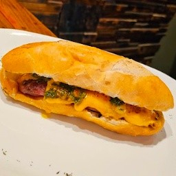 Sanduíche no pão francês com linguiça suína pura artesanal (200g)(peso in natura), acompanha queijo e chimichurri