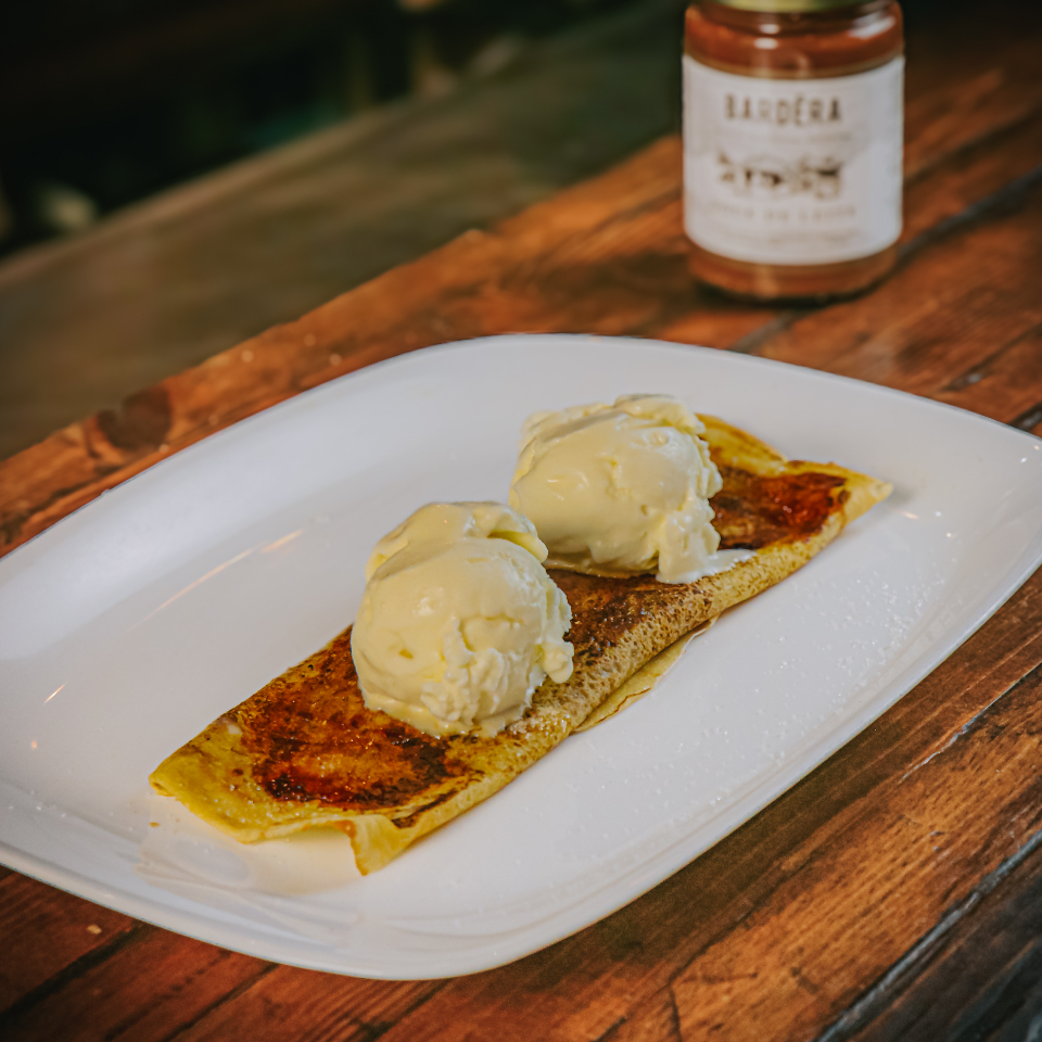 Panqueques de Dulce de Leche, uma celebração à tradicional sobremesa portena. Cada panqueca é cuidadosamente preparada e recheada com um generoso e cremoso doce de leite, proporcionando uma experiência doce e irresistível. Para complementar, a sobremesa é servida com nosso suave e fresco gelato de mascarpone, que equilibra perfeitamente os sabores e adiciona uma textura luxuosa ao prato. Uma tentação que harmoniza doçura e frescor de maneira perfeita!