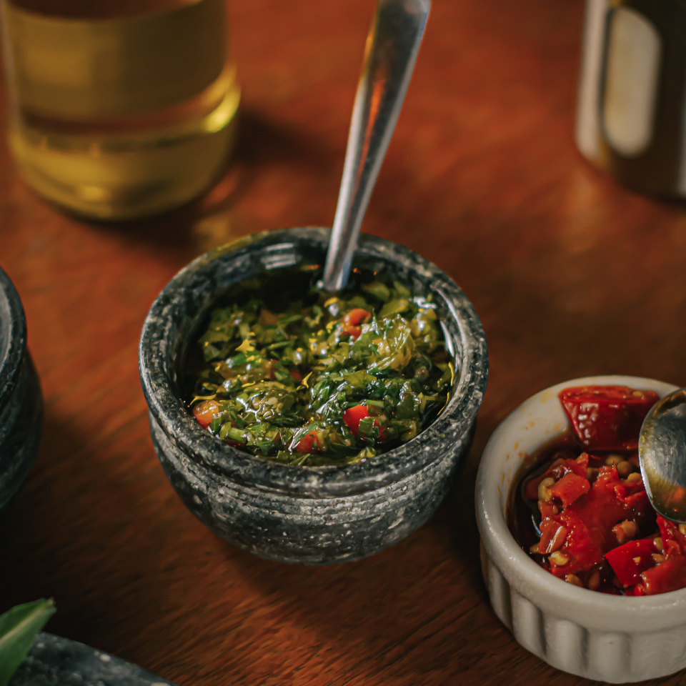 Este é o nosso autêntico molho Chimichurri, preparado diariamente em nossa casa com os ingredientes mais frescos. Criado para adicionar um toque especial e incrementar o sabor de seus pratos, este molho é o complemento perfeito para qualquer refeição. Seu paladar será surpreendido por esse tempero rico e cheio de personalidade. Experimente esse luxuoso acréscimo e transforme sua refeição em uma experiência culinária única.