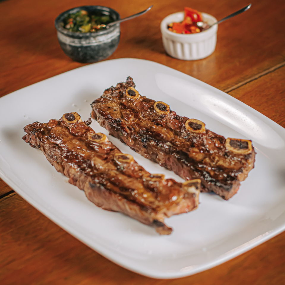 Apresentamos o Asado de Tira, uma seleção premium da parte mais nobre da costela do dianteiro, meticulosamente cortada em tiras de aproximadamente 600g. Este corte magnífico é cuidadosamente assado em nossa autêntica parrilla a lenha, conferindo à carne um sabor defumado, único e inconfundivelmente delicioso.