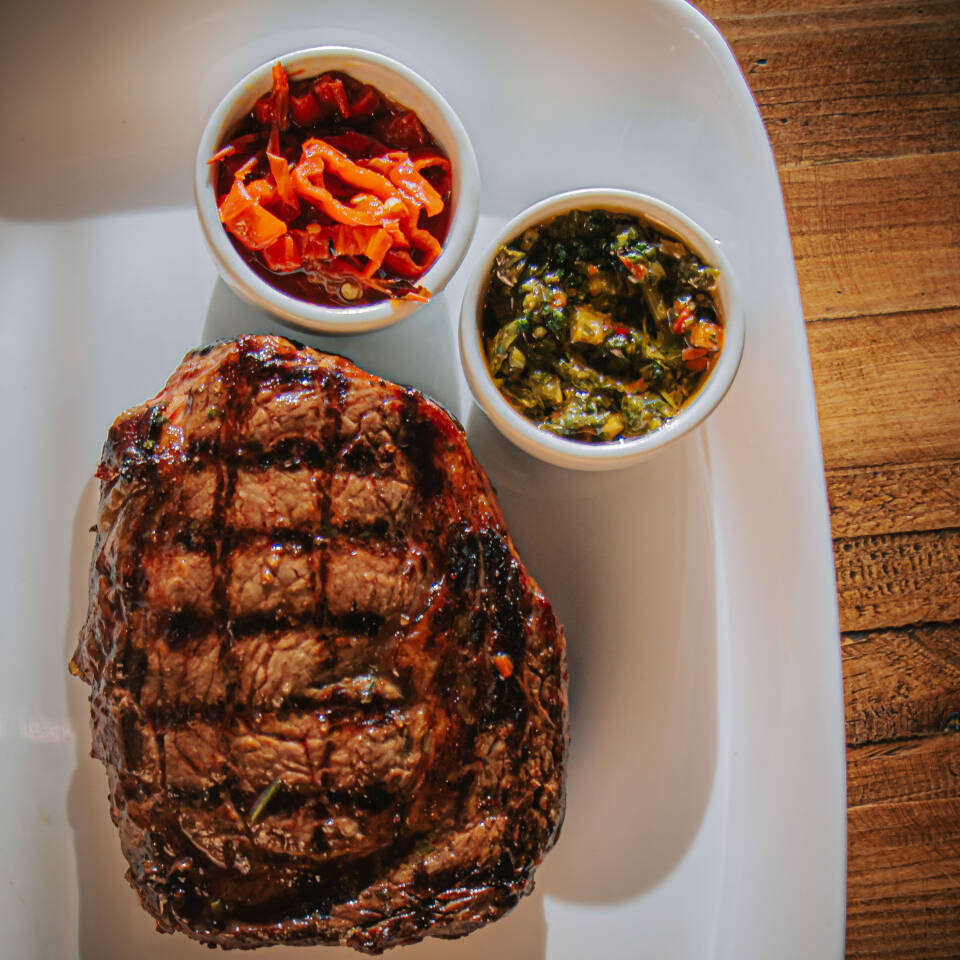 Delicioso Bife Ancho, com aproximadamente 400g, cuidadosamente assado na nossa autêntica parrilla a lenha. Este corte nobre apresenta uma suculência incomparável e um sabor que desperta todos os sentidos. Sua textura macia derrete na boca, enquanto a lenha confere um aroma rústico e inconfundível, tornando esse prato uma experiência gastronômica única e memorável. Ideal para os verdadeiros amantes de carnes. Uma verdadeira joia da nossa seleção.