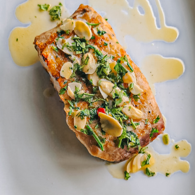 Lombo de Pirarucu grelhado na parrilla ( aprox. 250g) (peso in natura) grelhados na brasa, com molho de manteiga canastra e amêndoas laminadas. Nosso Pirarucu é servido "al dente" ponto correto que deve ser servido, não é desmanchando.