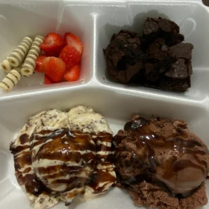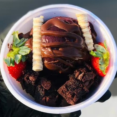 Brownie de 80grs mais duas bolas de sorvete de 150grs cada mais morangos e canudo waffles mais cobertura ao seu gosto