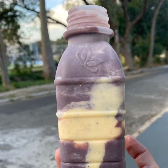 Açaí Batido Com. Leite em pó, granola , banana e muito Leite condensado. Ele ira no copo de isopor.